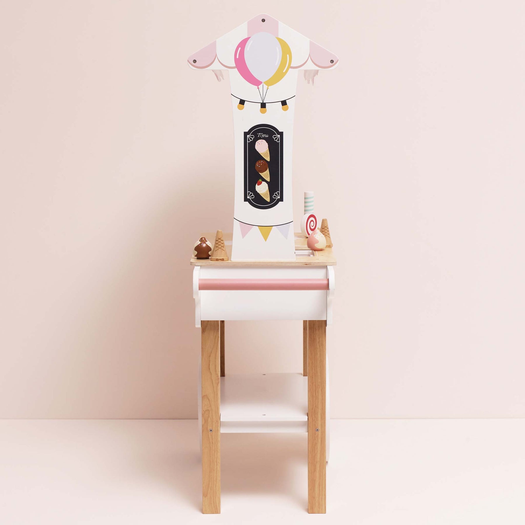 sign, while the other displays a colourful ice cream menu for customers to choose their favourites. Open the ice cream drawer to reveal three tasty flavours and serve up the fun with included accessories: 2 ice cream cones, 2 tops, and 2 ice lollies.