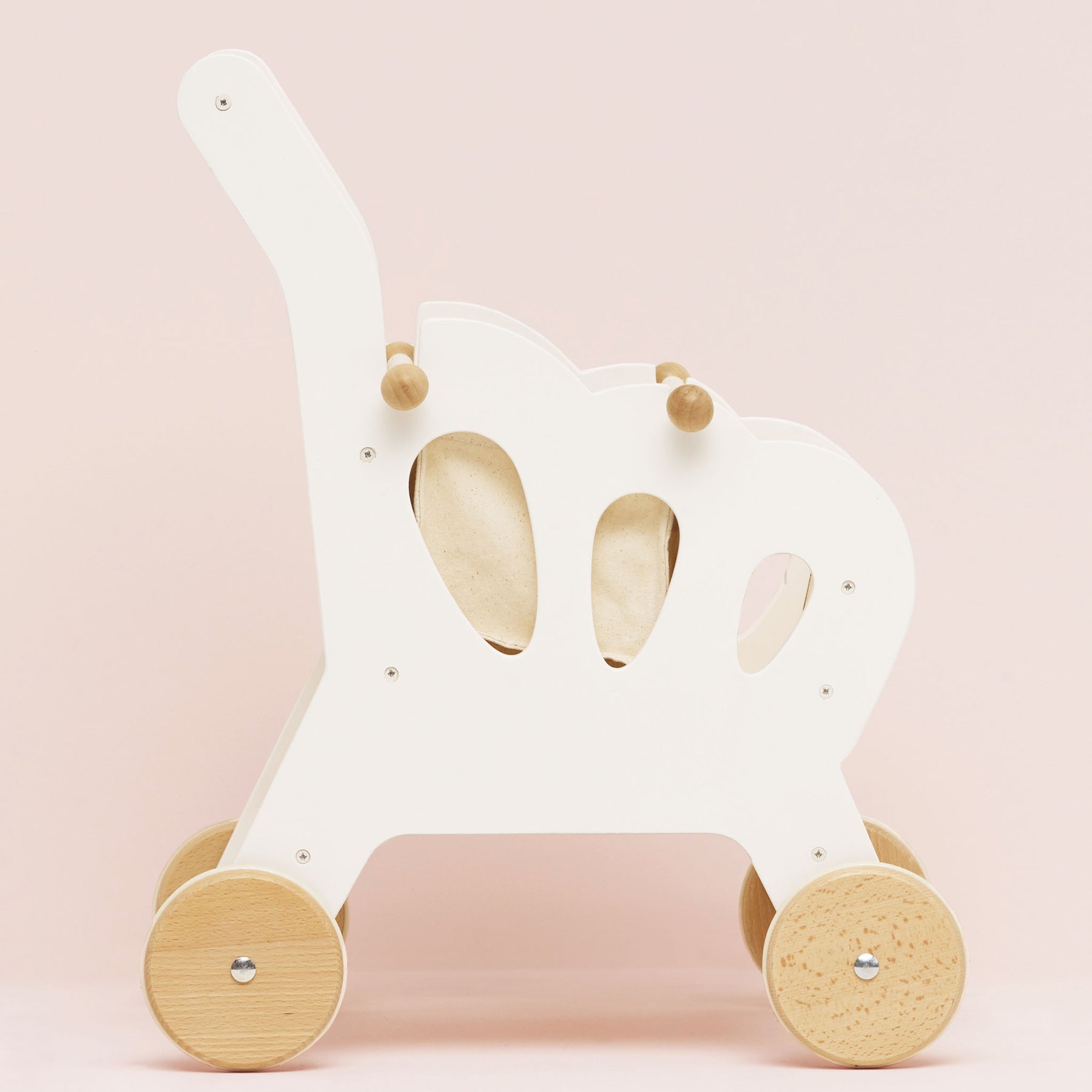 Painted in fresh white with natural wood accents, this trolley has kid safe edges and is crafted from sustainable wood, making it durable and built to withstand day after day play. Supporting early years development and education by encouraging social interaction and improving dexterity and fine motor skills.