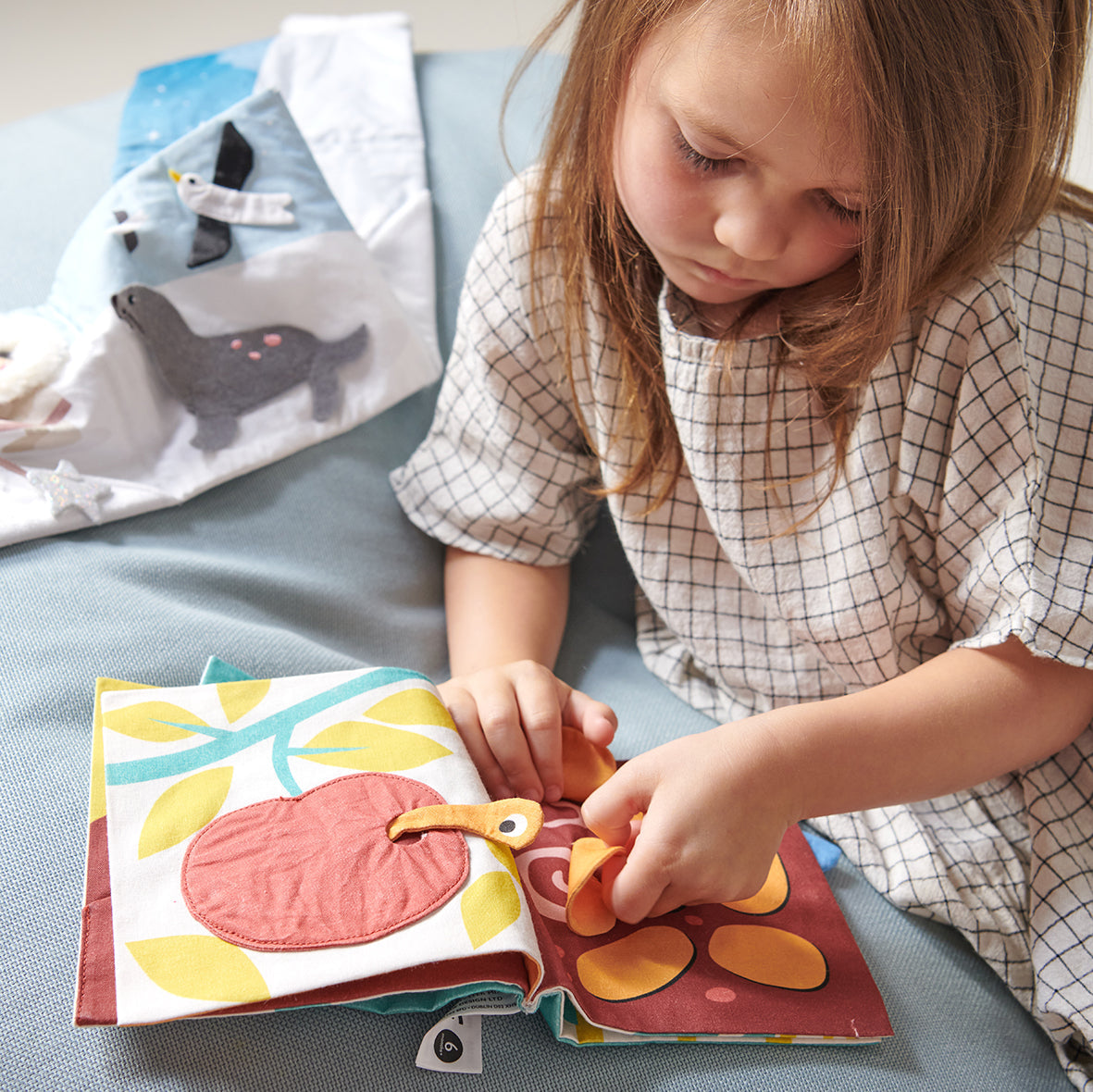 An arctic themed soft fabric activity book for babies, with illustrated polar animals and 10 different textured fabrics. Book folds out from a concertina to create a tactile flowing polar scene. Designed to encourage touch and feel senses for babies.