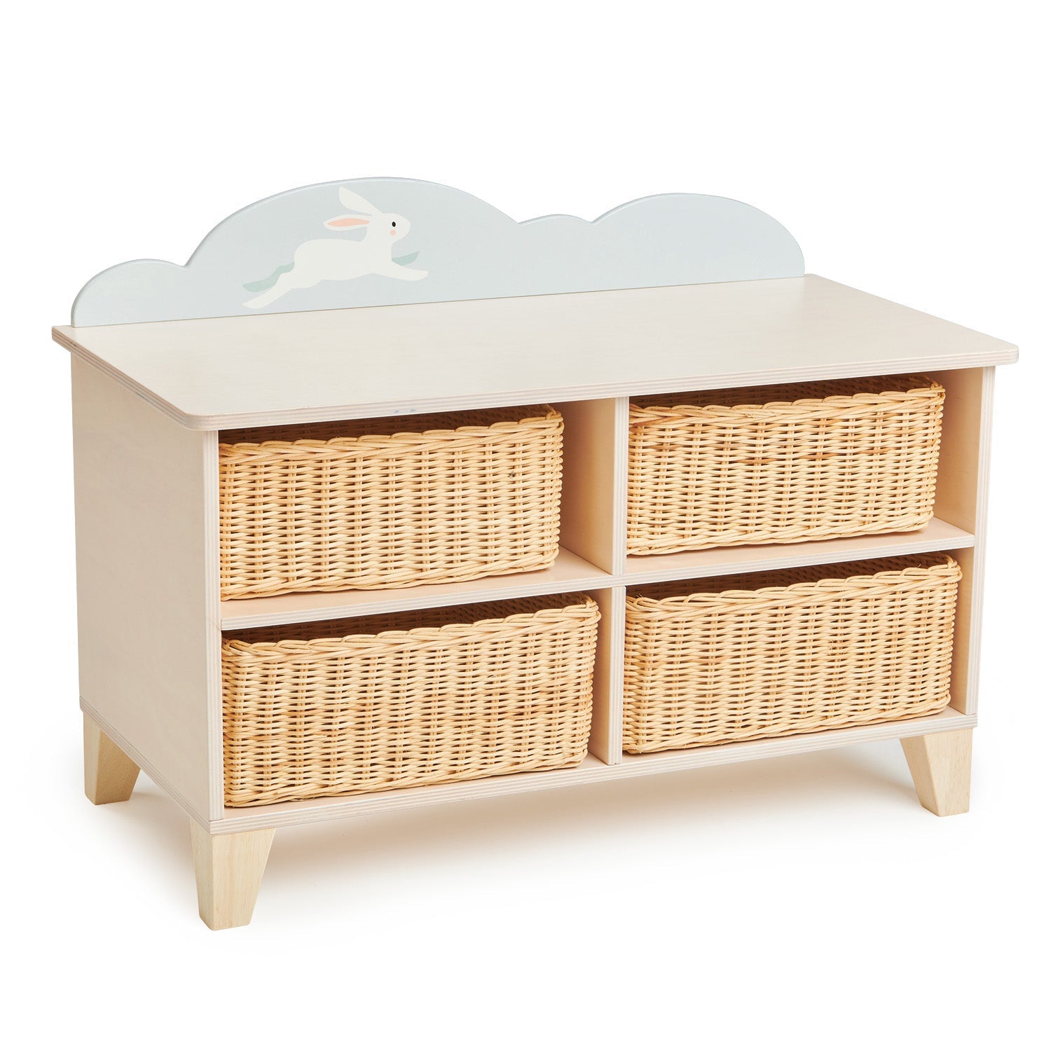 Beautiful in the nursery and ideal for any child's bedroom, this unit comes with 4 handmade wicker wood baskets that can be removed making it super easy to tidy away your toys. The best thing about this furniture is that it doubles up to be a handy bench for when you need a break from playing! Completely plastic-free and sustainably made with the highest quality wood, and a cloud feature makes this item completely unique and on trend.